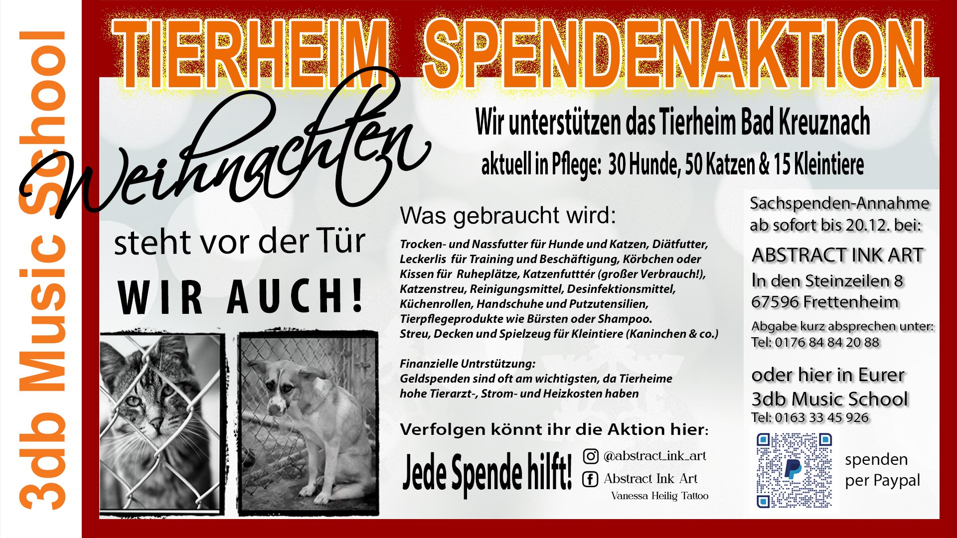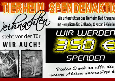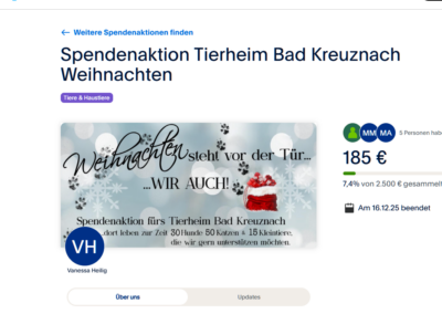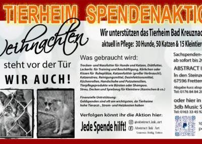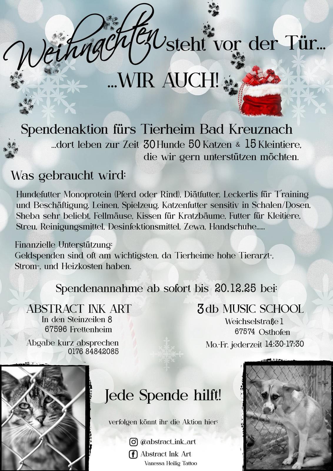 Gemeinsam mit dem Tattoo‑Studio Abstract Ink Art konnten wir in der Adventszeit zahlreiche Sachspenden sammeln und zusätzlich einen beeindruckenden Gesamtbetrag von 810 € am 23. Dezember 2025 an das Tierheim in Bad Kreuznach übergeben.